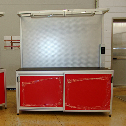 Questo banco di lavoro sagomato offre la possibilità di utilizzare gli ampi volumi degli armadietti per riporre utensili e attrezzeria varia. Sono proposti con doppia anta scorrevole e mensola interna, realizzati con profilo di alluminio A45, tamponamento rosso 3020, ripiano in gomma nera. La parte superiore del banco presenta illuminazione al neon e una retro-pannellatura di appoggio realizzata con lamiera ossidata in alluminio.